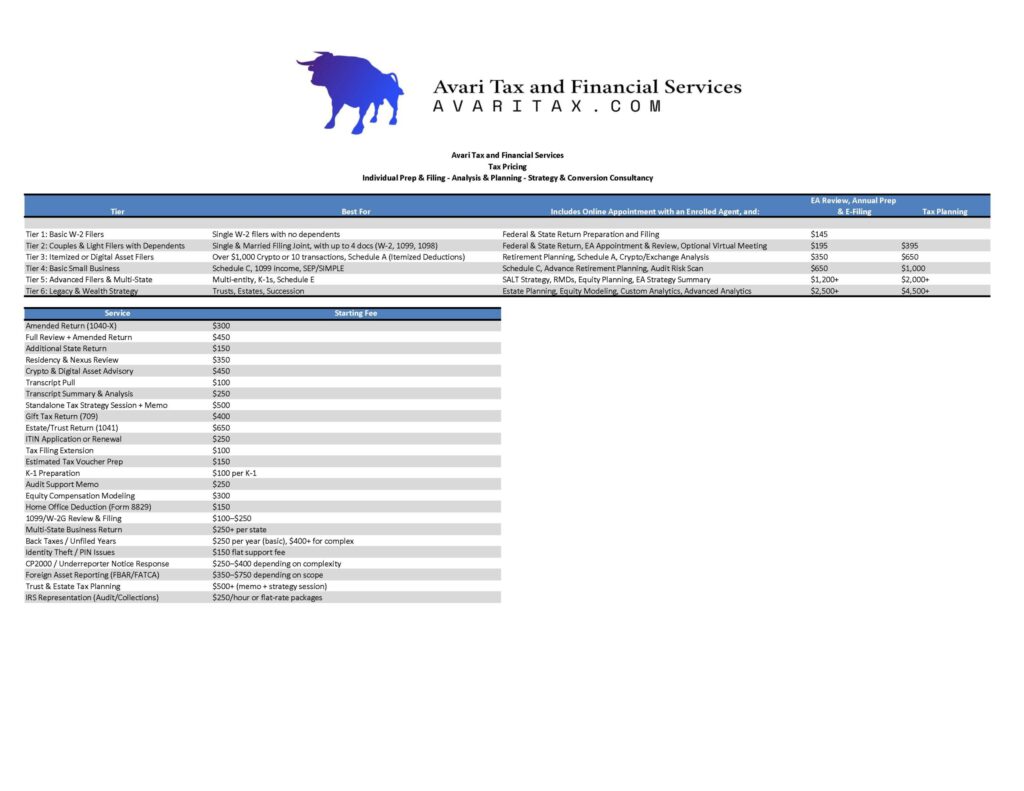 At Avari Tax, we believe pricing should be as clear and strategic as the services we provide. Whether you’re seeking IRS tax preparation, multi-state compliance, bookkeeping, or fractional CFO support, our approach is built around transparency, flexibility, and real value. No hidden fees. No generic packages. Just tailored solutions that reflect your complexity, your goals, and your need for clarity. Below, you’ll find a detailed breakdown of our service tiers—designed to meet you where you are and grow with you as your needs evolve. If something doesn’t fit perfectly, we’ll customize it. Because at Avari, every engagement starts with understanding—and ends with empowerment.